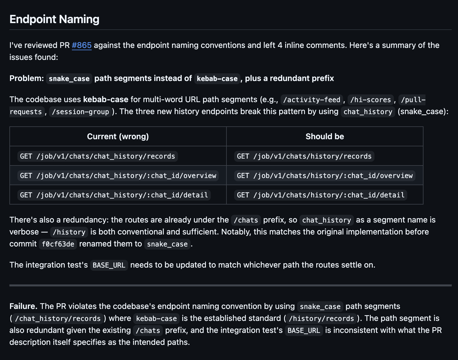 Here is a concrete example. We wanted to enforce REST endpoint naming conventions on every PR to our orchestration service. The whole setup took a few minutes.